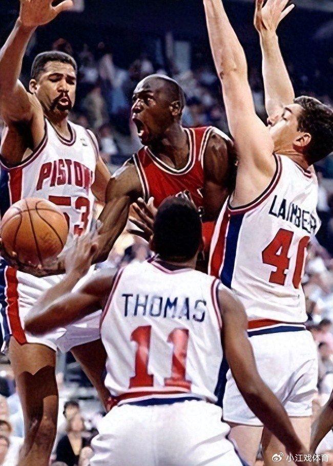 当年活塞在季后赛对阵公牛带领的乔丹时,他们有着专门的“乔丹法则”,防守乔丹的时候无所不用其极,甚至还使出了蒙眼防守的招数,所以他们才能够在88-90年连续三次在季后赛里击败乔丹,总决赛上也是靠着这样的防守在89年和90年取得了两连冠。
